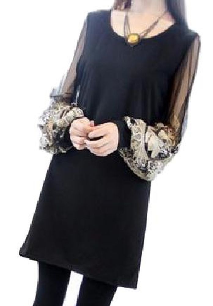 - 2.チュニックワンピ 袖 刺繍 大人 エレガント ミニ 丈 黒 XL