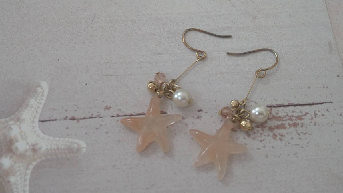 - 薄ピンク色ヒトデモチーフ×ゴールドからー・バー 揺れるピアス