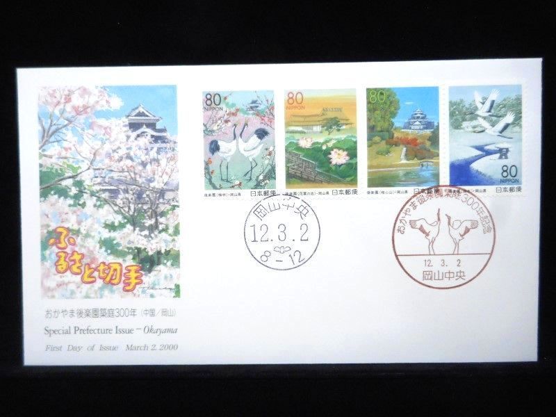 - ふるさと切手 おかやま後楽園築庭300年 4種連刷 2000年3月2日 岡山中央 初日カバー FDC 日本切手 M-804