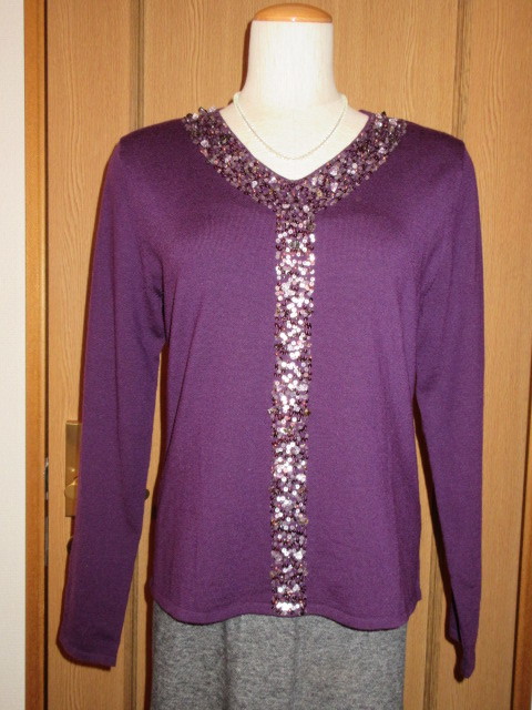 - E)■【ブランドタグCUT】■ふんわり暖か毛90%■Vネックに豪華なビーズ/ラメ/ストーン■裏側も高級ニット■ボルドー系セーター ■