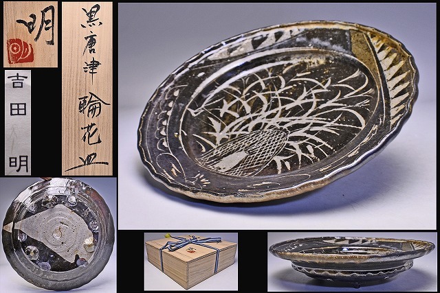 - 吉田明 ★ 黒唐津 輪花皿 ★ 共箱 栞 ★ 薫陶 : 江崎一生 ★ 足付きの造形が良く書き込まれた絵付が素晴らしい逸品 ★ 食器 ★