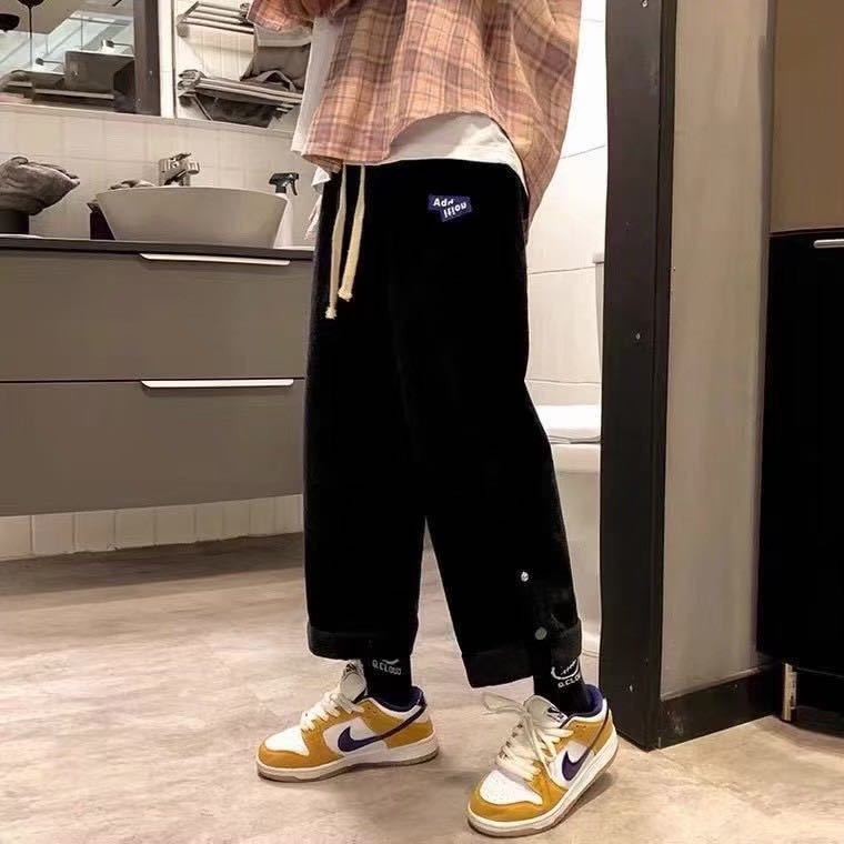 - ワイドパンツ ボトムス コーデュロイ ストレートパンツ ユニセックス 男女兼用 黒 ブラック L