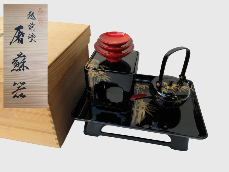 - 越前塗 屠蘇器 正月 新春 ■ 黒漆塗 美しい 竹蒔絵 朱塗三ツ組盃 ■ 木製 酒器 漆器 道具 縁起 木箱入り№9189■