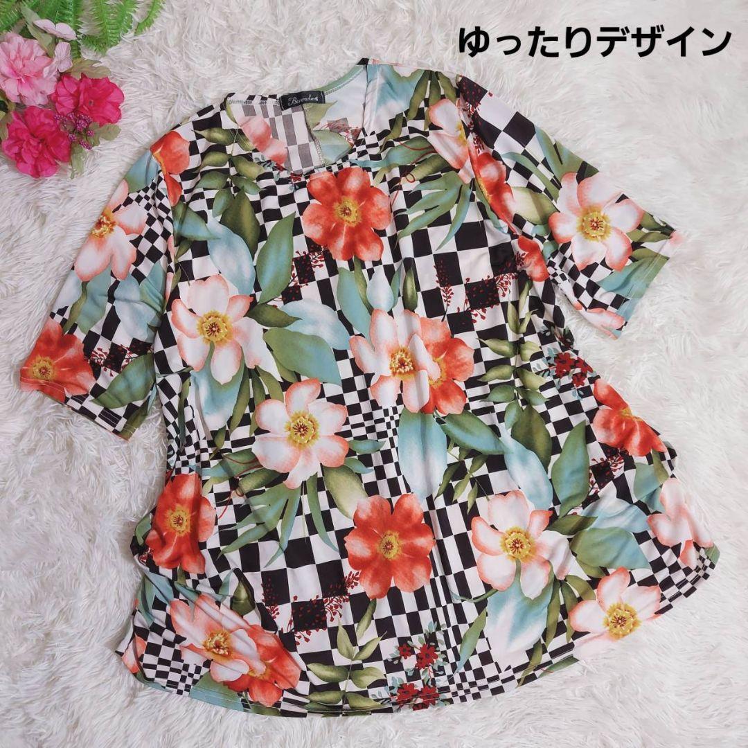 - マルチパターン花柄・Aライン・五分袖トップス・強ストレッチ・総柄・派手 ゆったりデザイン 大きいサイズ 67808