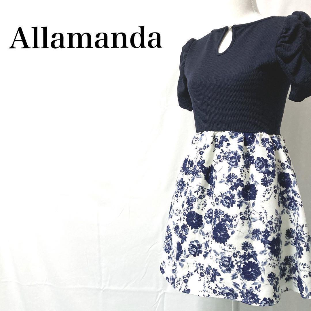 - Allamanda 可愛らしい 袖ギャザー 花柄 ワンピース アラマンダ ネイビー ホワイト M ウエスト切り替え パフスリーブ