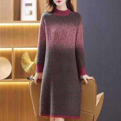 - 【ピンク&グリーン色★Lサイズ】長袖 ひざ丈 ニットワンピースおしゃれ
