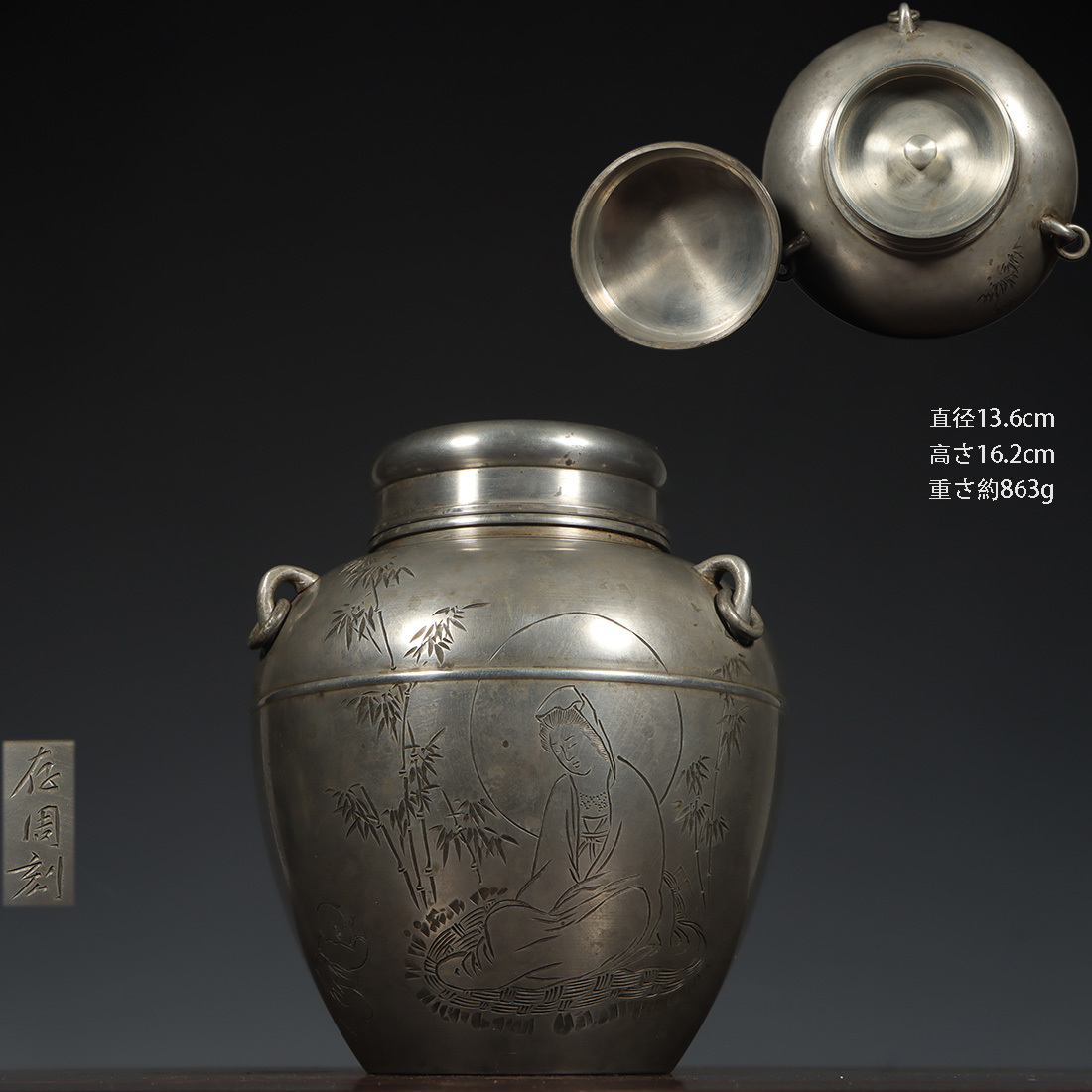 - 古錫 茶葉罐 沈存周刻 「錫刻童子観音詩文図三系耳茶心壺」 茶筒 茶入 茶壷 茶道具 純錫 金工 茶器 時代物 LT-1173