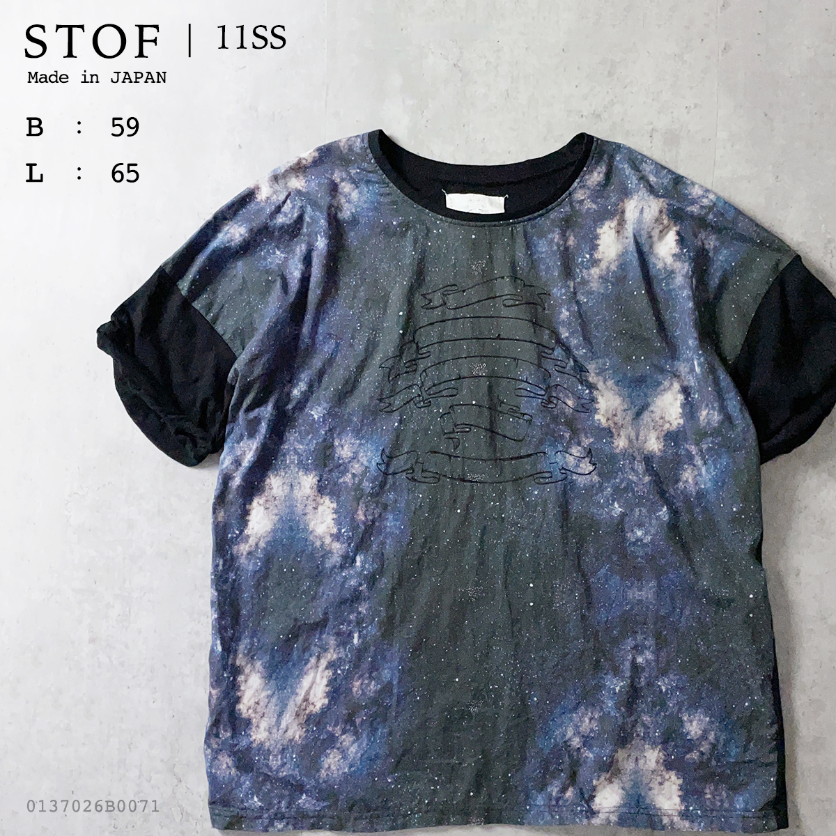 > STOF ストフ F / メンズ L 相当 ショート丈 総柄 グラフィック 切り替え プリント 半袖 Tシャツ 紺 ネイビー 綿 100% コットン 宇宙 星空