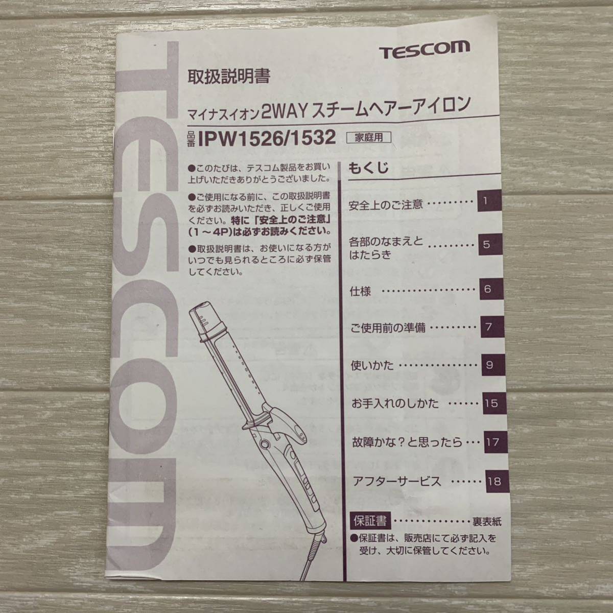 - 取扱説明書のみ テスコム 2WAY マイナスイオン スチームヘアアイロン IPW1526/1532 TESCOM ストレート カール ヘアセット 髪の毛 180℃ 冬