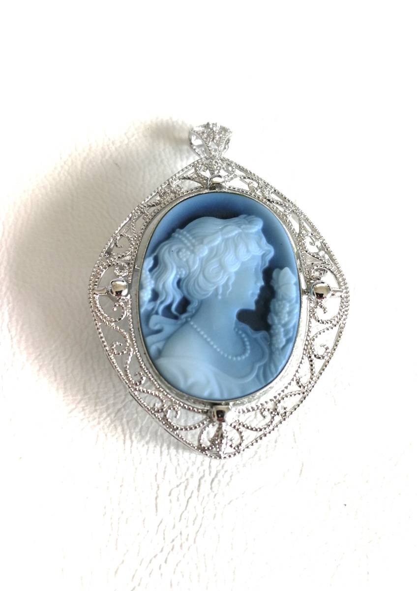 - ブルーメノウカメオ・K14 WG・ダイヤモンド0.09ct・トップ回転可能の正背面両用・ネックレスペンダント・ブローチ兼用
