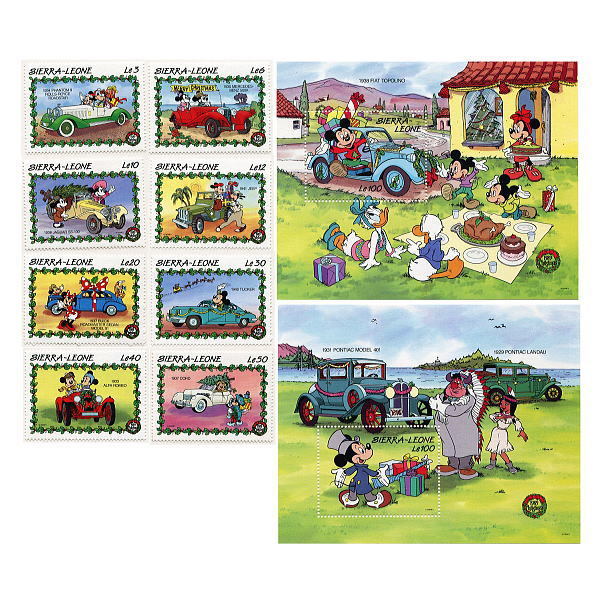 - ディズニー ミッキー ミニー ドナルド デイジー 切手/小型シート2枚&切手8枚(自動車) 発行国Sierra Leona 1990年発行 新品