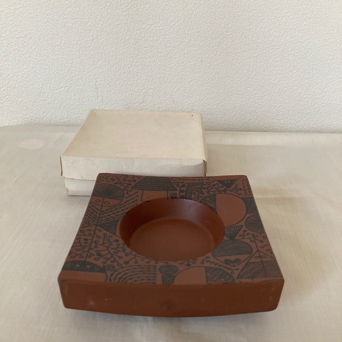- 陶器製 焼き物 レトロな灰皿 1枚 当時物 サイズ 12㎝×12㎝、高さ 約 3.5㎝ ファンシーな柄