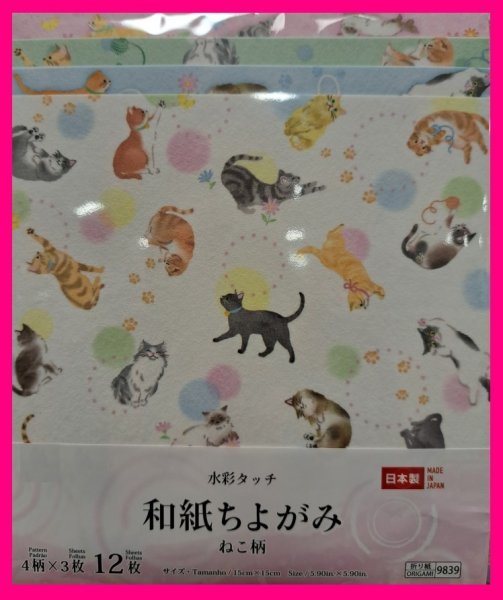 > 【送料無料:素材の奇麗な おりがみ:水彩 タッチ 和紙 ちよがみ(ねこ柄:12枚:4柄x3枚)】★可愛い「猫柄」★15cm:D:千代紙:折り紙:折紙