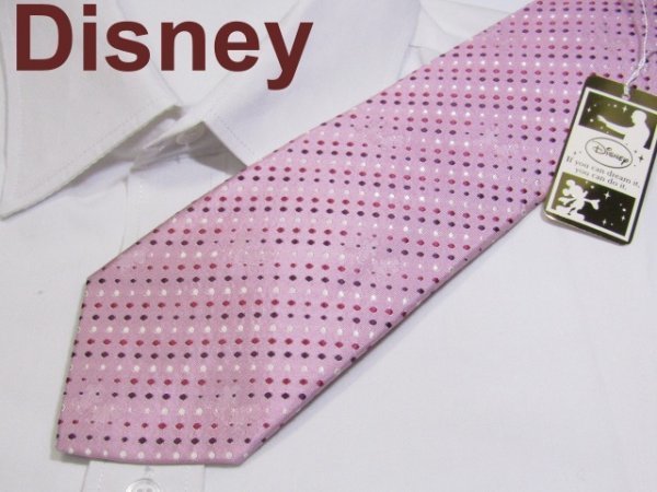 > 【ディズニー ミッキィー】B 718 ディズニー ネクタイ Disneyピンク色系 ドット柄ジャガード 隠しミッキーとミニー絵柄 未使用タグ付き