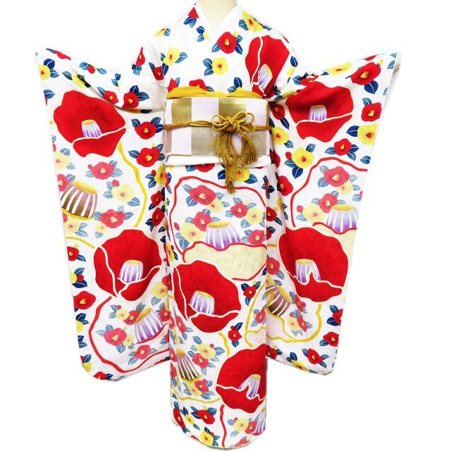 - 振袖 着物 中古 リサイクル 正絹 花模様 椿 鹿の子 白色 赤色 多色 身丈170cm 裄68cm L トール きもの北條 A972-9