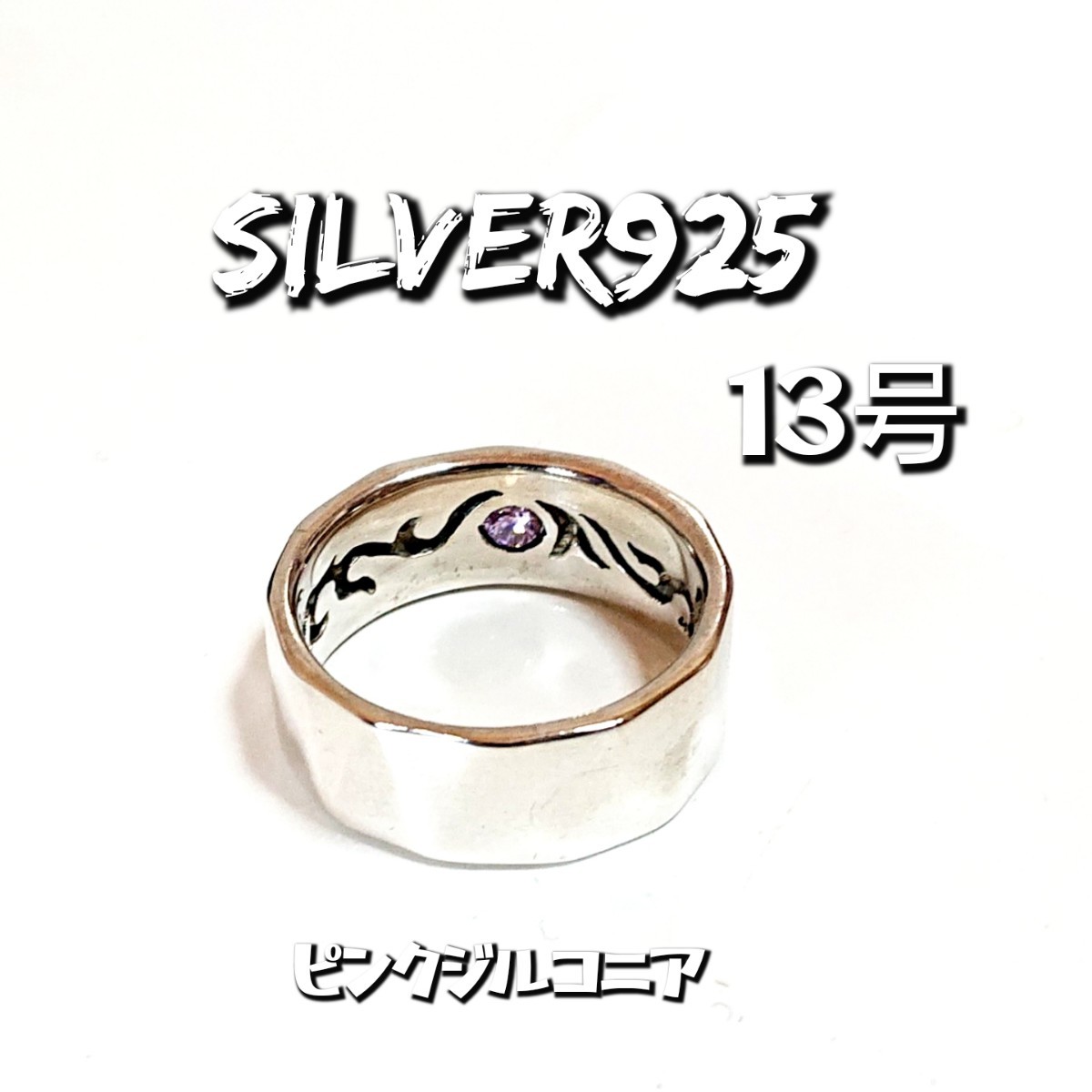 - 0716 SILVER925 ピンクジルコニア 平打ちタタキリング13号 シルバー925 アラベスク シンプル 唐草 トライバル 平板 槌目三角 ユニセックス