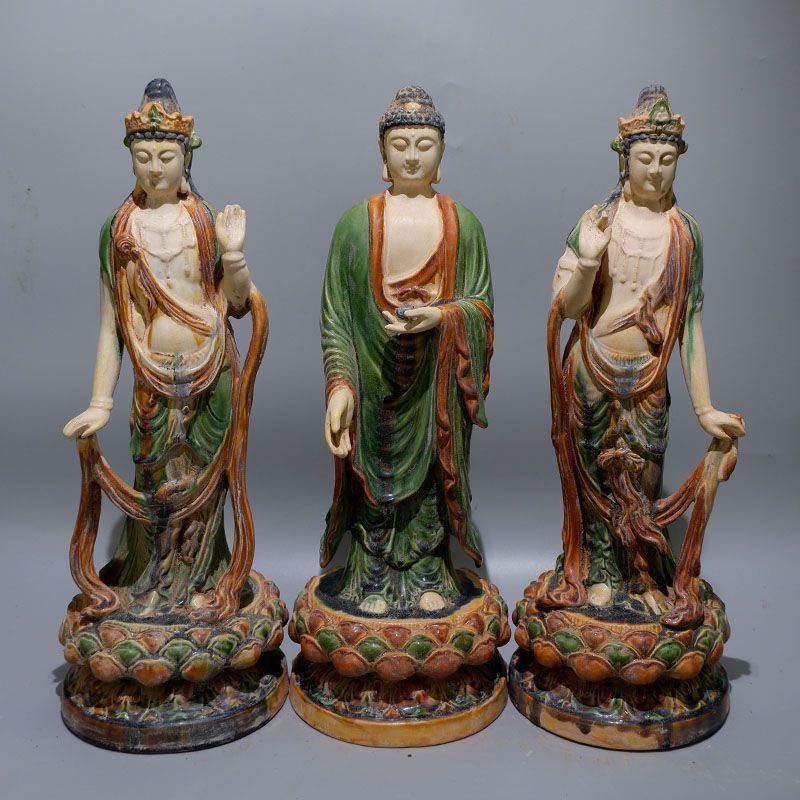 - 【伝世蔵品】中国旧蔵古美術古玩 極細工 唐三彩 阿彌陀三尊中尊:阿弥陀如来、観音菩薩、勢至菩薩 掘り出し物 文物 時代物