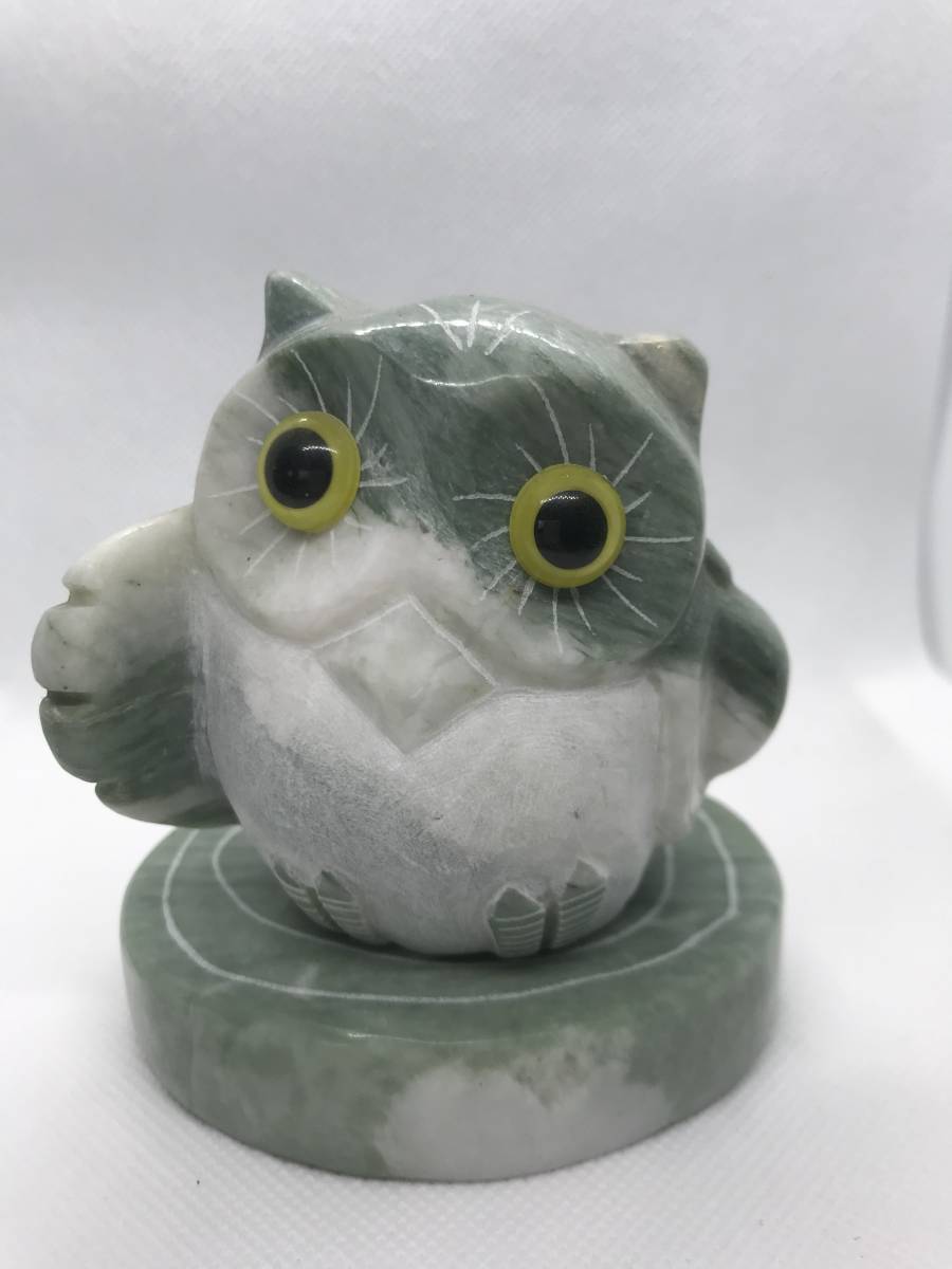 - 【彫刻】フクロウの置き物/大理石/グリーン/切り株の台座付き♪〈オブジェやインテリア等にオススメ♪〉【美品】