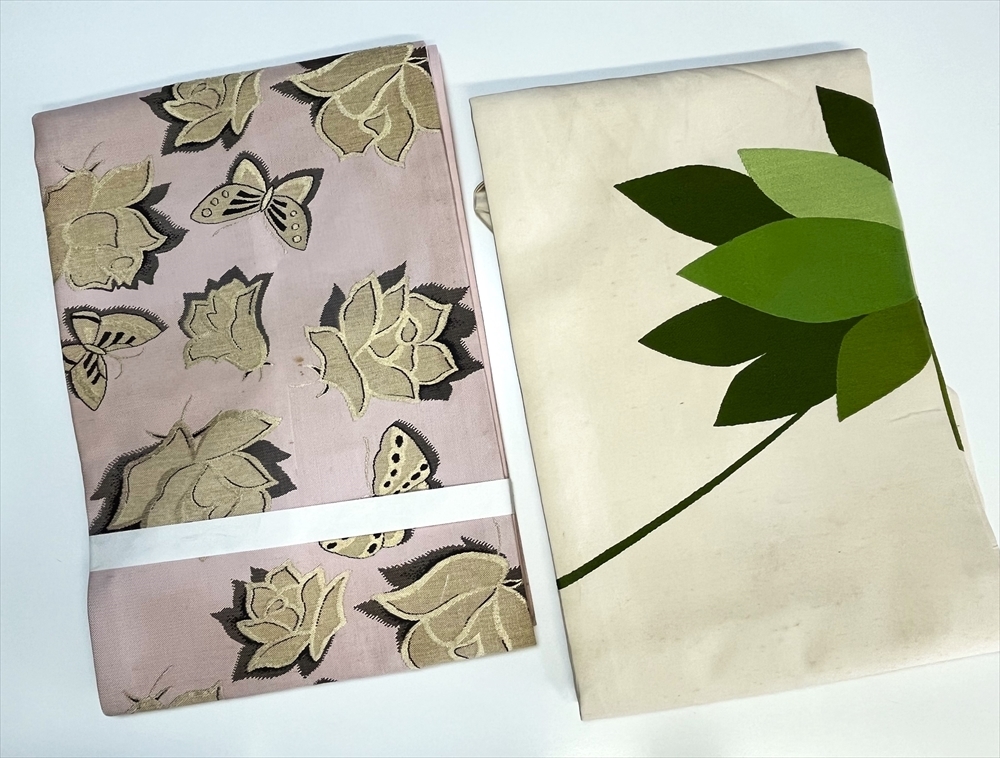 - 花とら●リサイクル帯 名古屋帯 クリーム地 葉 薄桃 薔薇 蝶 アールデコ風 リメイク 素材 240129