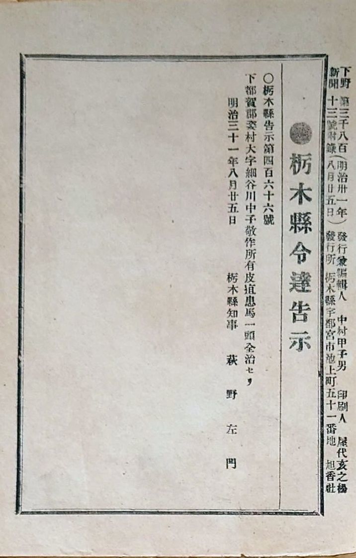 - f24020711〇明治令達告示下都賀郡 馬科動物の伝染性慢性疾患 皮疽患馬一頭全治 栃木県 明治31年〇和本古書古文書