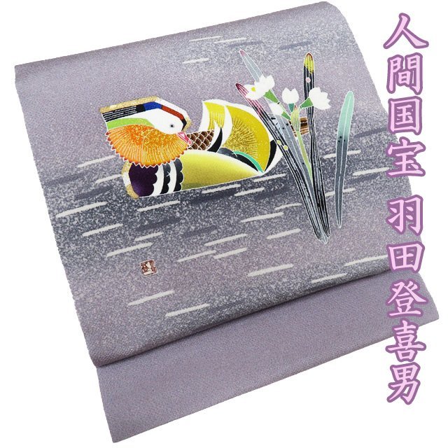 - 特選 開き名古屋帯 なごや帯 中古 リサイクル 正絹 カジュアル 人間国宝 羽田登喜男 縮緬 鴛鴦と花の図 薄鼠色 多色 きもの北條 A979-14