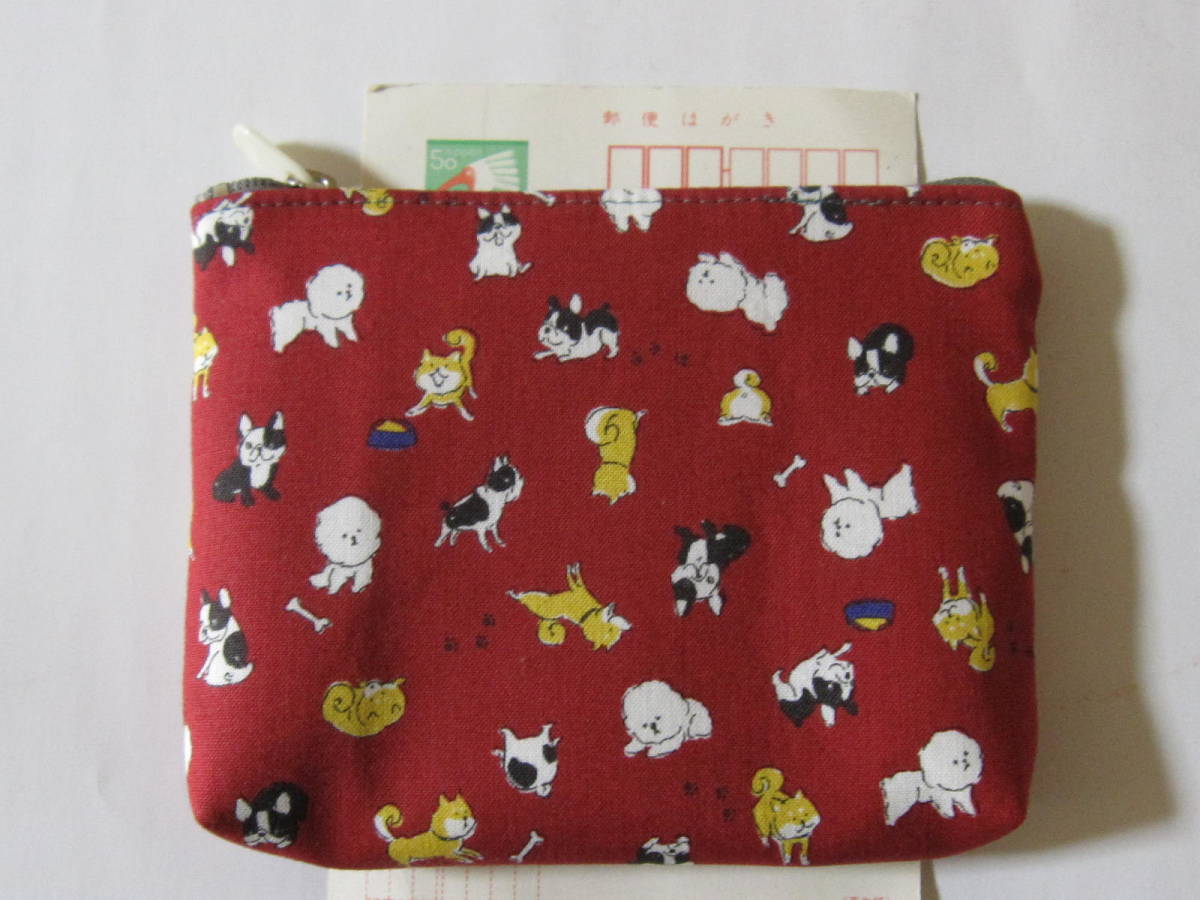 - 手作り 小物 ポーチ 濃い赤 犬 動物 模様 子犬 ハンドメイド 柴犬 フレンチブル ビジョン 財布 充電器 男女兼用 キュート アニマル 綿 可愛