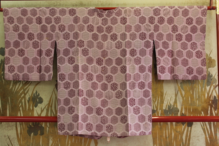 - きもの今昔6485 道行コートコレクション 高級正絹一越地 亀甲中小紋(多種多様の小紋) コート丈81cm
