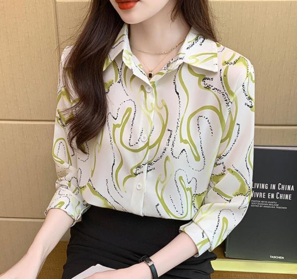 - 春新品 / エレガント ブラウス シャツ レディース 長袖 シャツ キレイめ プリント 可愛い 大人 お出かけ 行事 シフォン トップ/緑