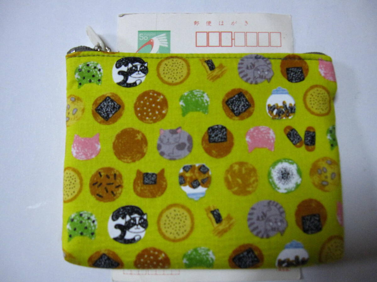 > 手作り 小物 ポーチ 猫 せんべい 柄 模様 おかき 煎餅柄 ハンドメイド 動物 ねこ 財布 充電器 男女 兼用 動物 可愛い 綿 マスタード ネコ