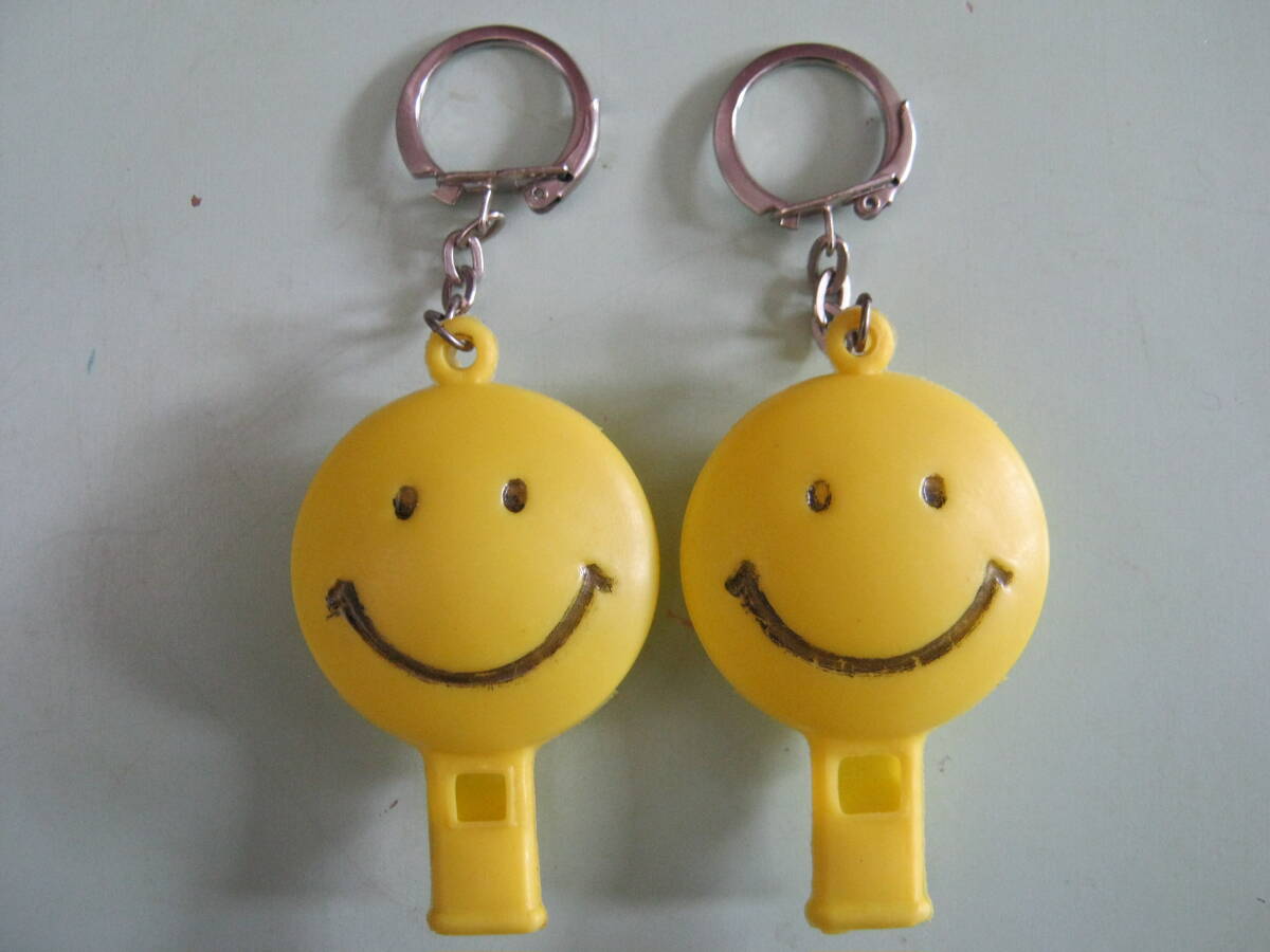 - 【スマイル型の笛付きキーホルダー2個セット(ポリ製・1970年代・駄菓子屋玩具)】①