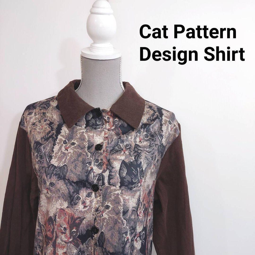 - 猫いっぱい 切り替えデザイン 長袖シャツ 茶色ブラウン系 総柄 アニマル 表記M 実質L 66160