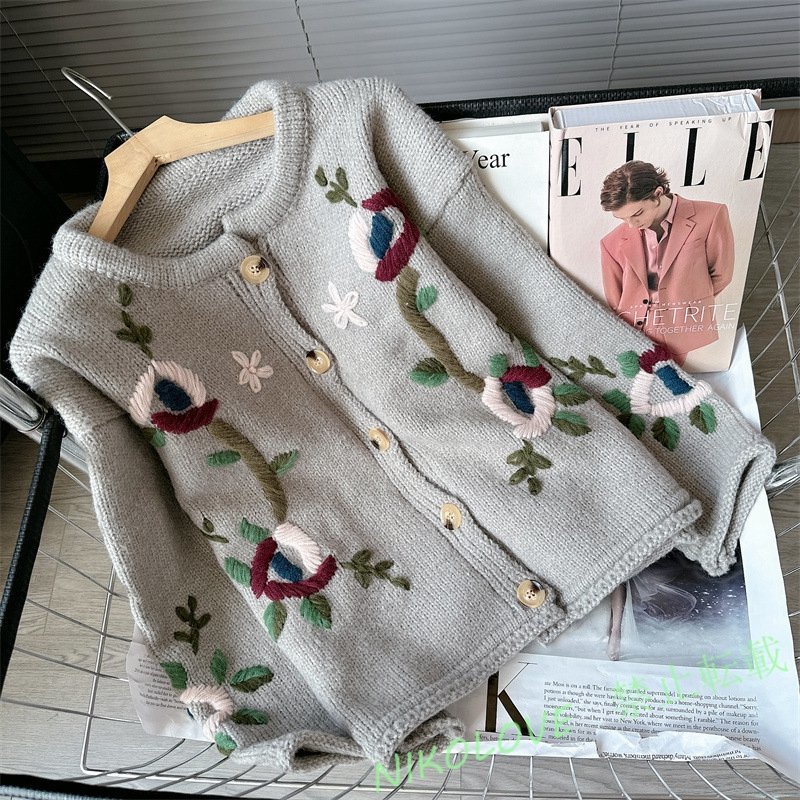 - 新品 ニット カーディガン 大人可愛い 着映え セーター おしゃれ レディース ゆったり チュニック 前開け 豪華 刺花柄 グレーAA426
