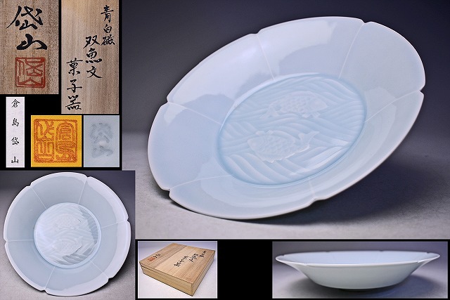 - 倉島岱山 ★ 青白磁 双魚文 菓子器 ★ 共箱 共布 栞 ★ 須恵焼岱山窯 ★ 中国 宋時代の定窯白瓷の具現 ★ 美しい釉景の逸品 ★ 茶道具