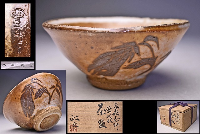 > 今井政之 ★ 象嵌 志野 蛍袋 茶碗 ★ 共箱 ★ 縁:楠部彌弌 ★ 象嵌を得意とさせる氏の希少手 ★ 茶道具 ★