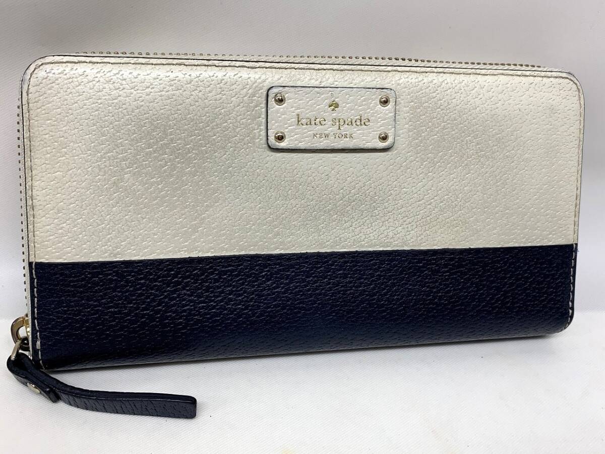 - kate spade ケイトスペード 長財布 ラウンドファスナー レザ― ロゴプレート アイボリー×ネイビー 12時間以内に送付