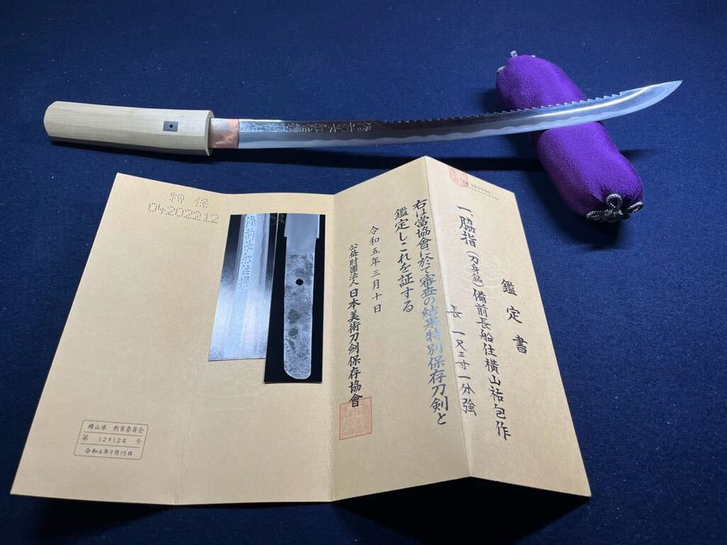 - 日本美術刀剣保存協会 特別保存 海賊刀 鋸刀 刀身銘 備前長船住横山祐包作 検索 志々雄真実 るろうに剣心 備前刀