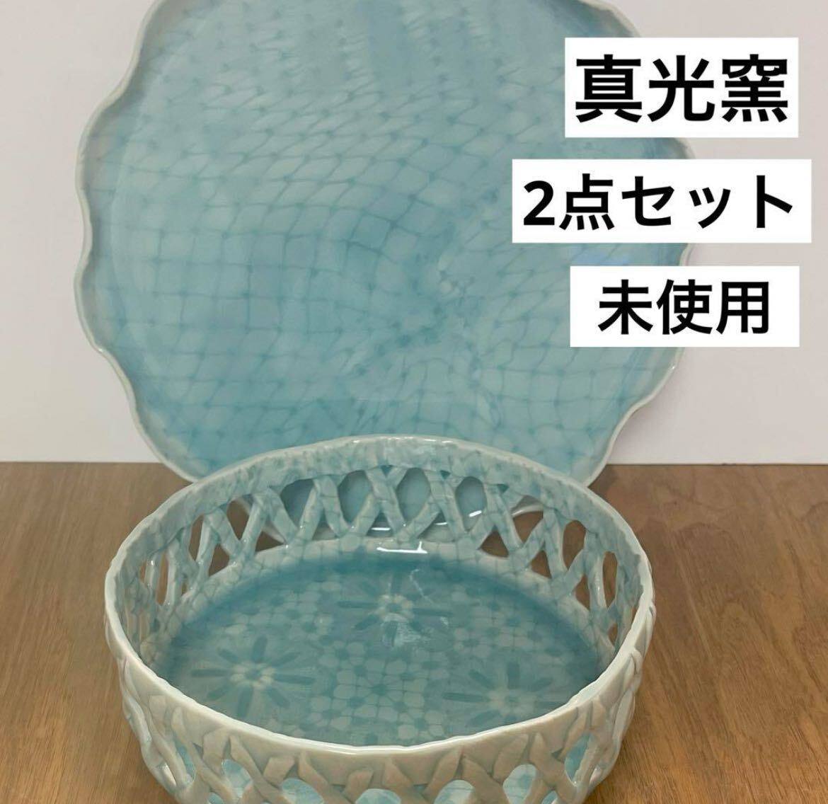 - 未使用◇有田焼◇真光窯◇青白磁かごめ鉢+プレート2点セット