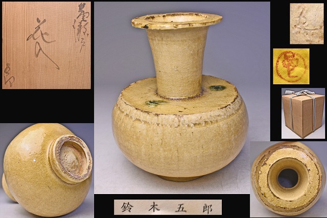 - 鈴木五郎 ★ 黄瀬戸花入 ★ 共箱共布栞 ★ 瀬戸焼 の 人気陶芸家 ★ 人気の黄瀬戸作品 ★ suzuki goro ★ 砧形 ★