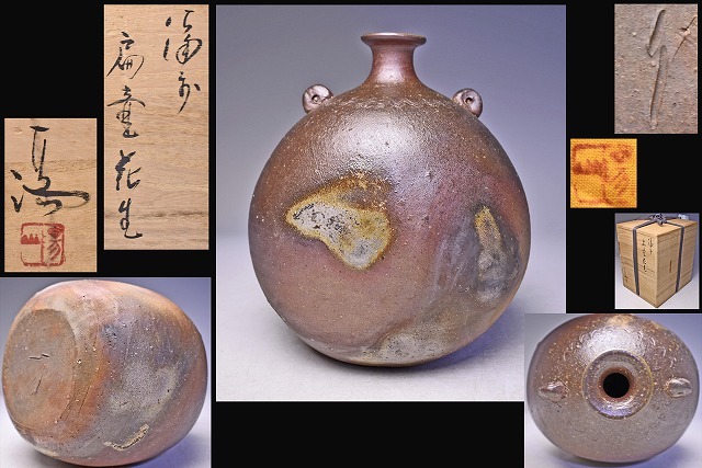 - 伊勢崎満 ★ 備前扁壺花生 ★ 共箱共布 ★ 耳付花入 ★ 人間国宝 伊勢崎淳 の兄 ★ 伊勢崎陽山 の子 ★ 県重要無形文化財保持者