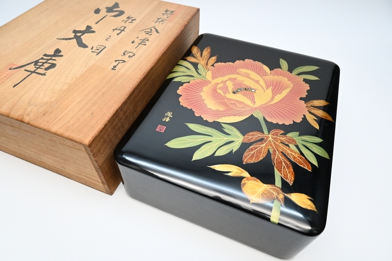 - 文箱 手元箱 ■ 文箱 [ 牡丹図 蒔絵 螺鈿 ]■ 特選会津塗 銘有 木製 共箱 R№ 9714■
