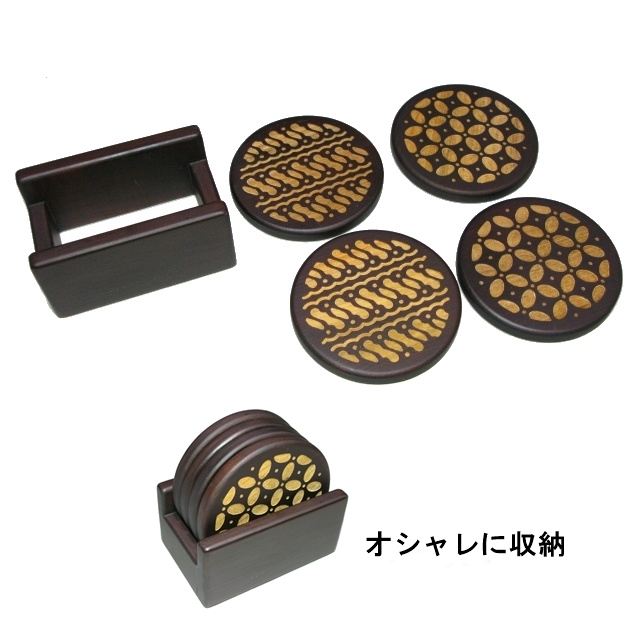 - アジア雑貨 おしゃれな コースター 4個 スタンド付 セット バティック調 チーク材 即♪≫