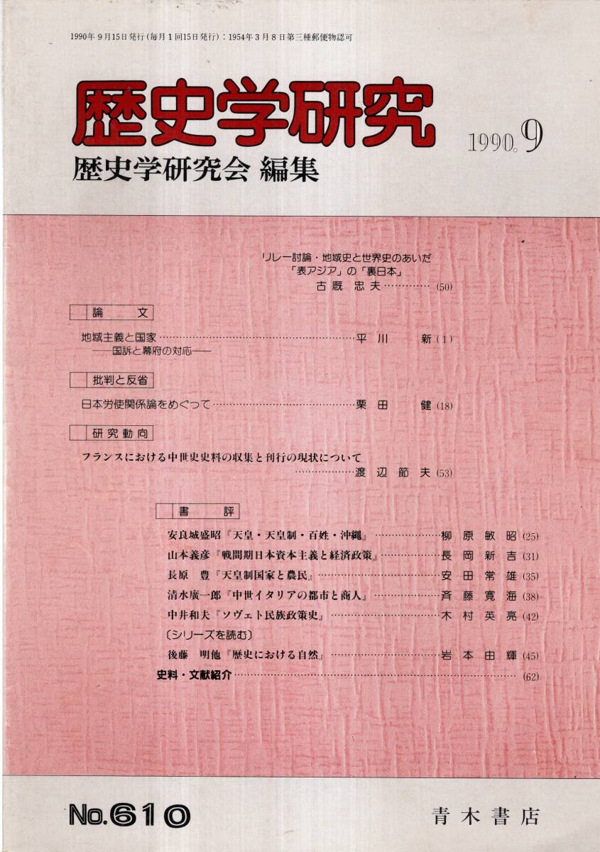 - 歴史学研究No610 地域社会と国家ー国訴と幕府の反応=平川新・日本労使関係論をめぐって=栗田健等 ほかに古厩忠夫・渡辺節夫・柳原敏昭他