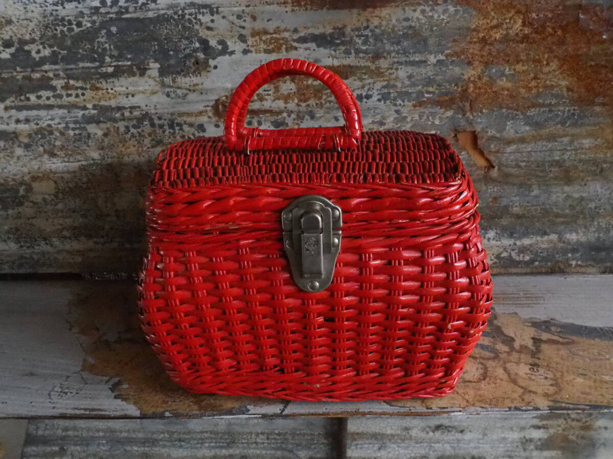 - 【フランス蚤の市赤いピクニックバスケット】本革ワイヤー古道具レザー真鍮鋲パニエ弁当アンティーク道具箱シャビー籠インテリア収納ケース