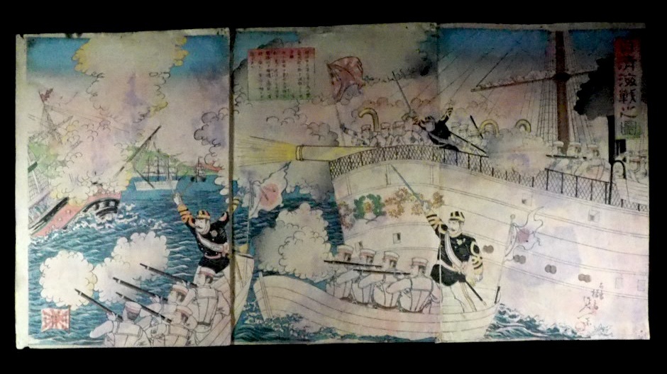 - 戦争絵 浮世絵木版画 錦絵 楊斎延一 「 日清海戦之図 」3枚綴り SMN604(21-9)