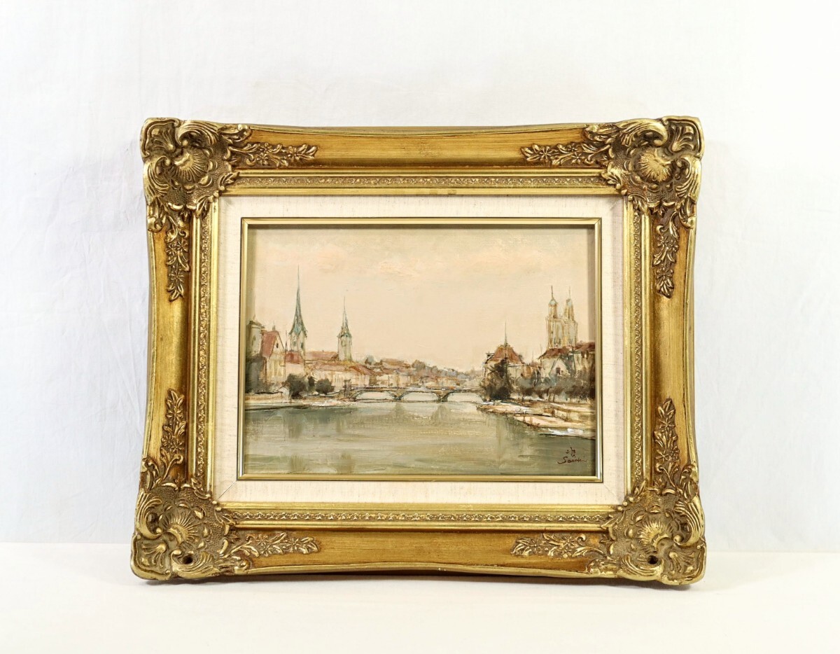 - 真作 佐々木壮六 1989年油彩「ミュンスター橋 チューリッヒ」画寸 F4 大阪府出身 詩情の画家 抒情的な作風 リマト河畔の街並みと尖塔 8972
