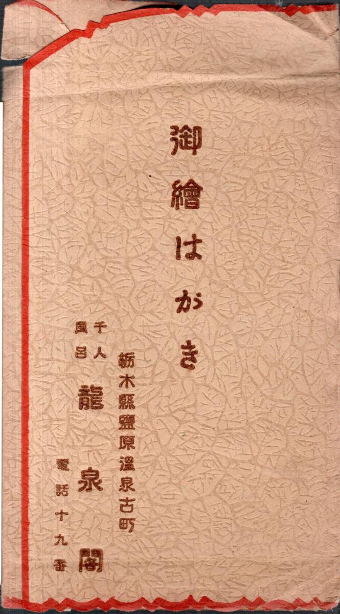 - 絵葉書 栃木県塩原温泉古町 千人風呂龍泉閣 温泉旅館建物鶴の池辺庭園小景等未使用絵はがき3枚タトウ付