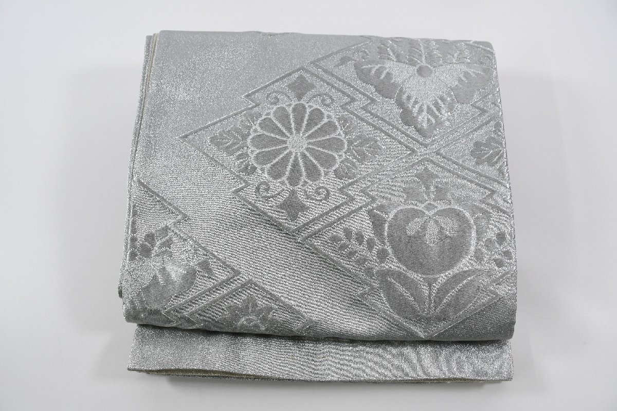 - 袋帯 未仕立て 銀糸 菱文 花 六通柄 帯丈422cm ★着物屋 ne-9743 桜庭呉服店