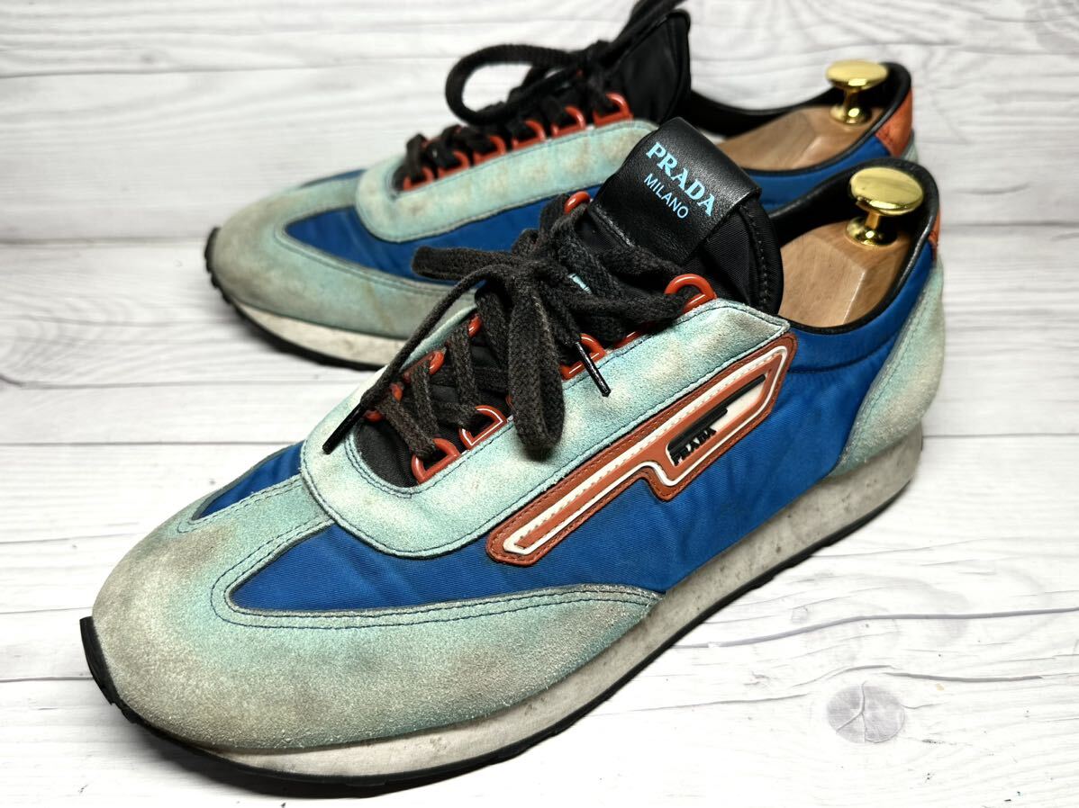 > 【即決】 PRADA プラダ メンズ 25.5cm程度 イタリア製 6.5 スニーカー 靴 レザー 6276 水色 青 くつ ブランド スエード ナイロン