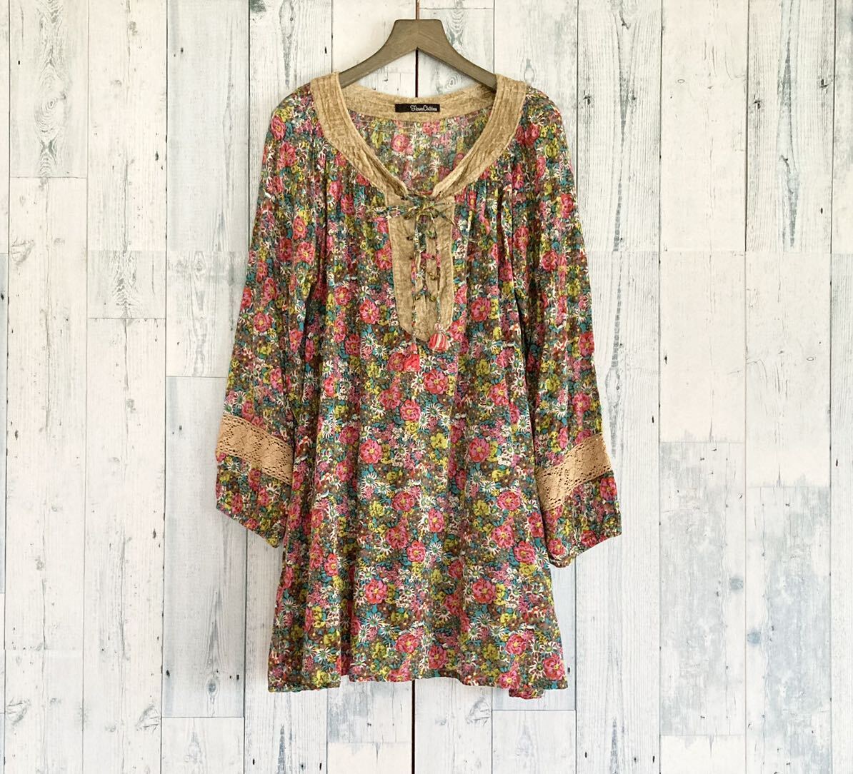 - ◆美品◆ FLOWER CHILDREN フラワーチルドレン ヒッピー ラブ&ピース 花柄 長袖 チュニック ブラウス ワンピース レディース F