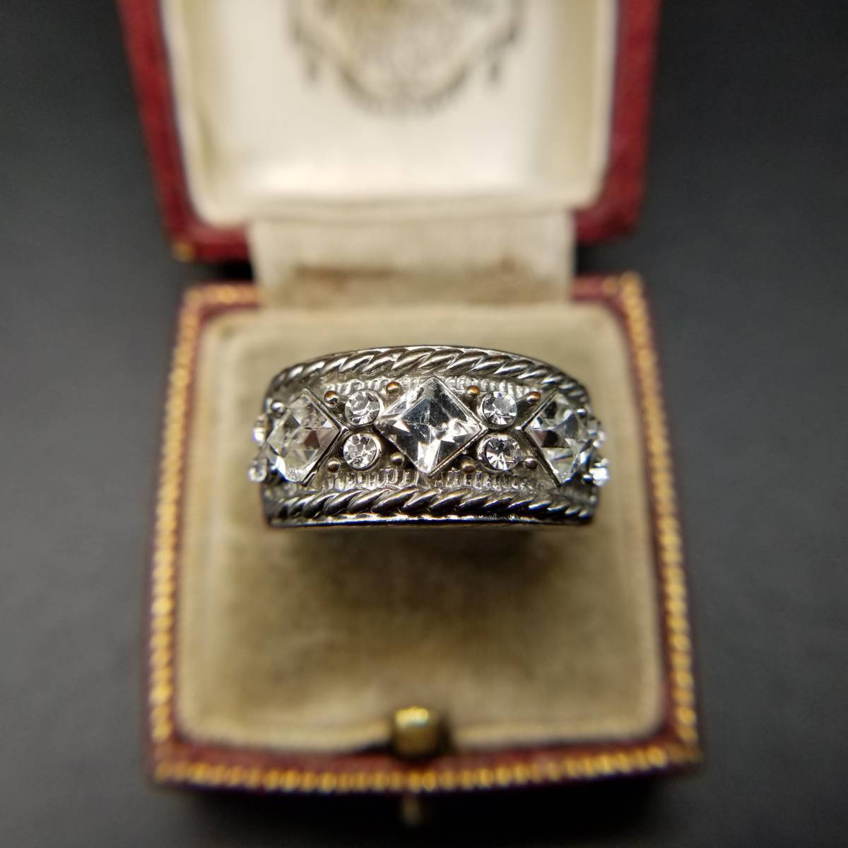 - ダイヤカット ラインストーン 装飾 ケーブルリム ヴィンテージ テーパード リング 指輪 シルバートーン コスチュームジュエリー YND③1